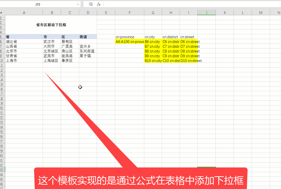 可以在表格中直接使用公式制作省市区街道四级联动下拉框