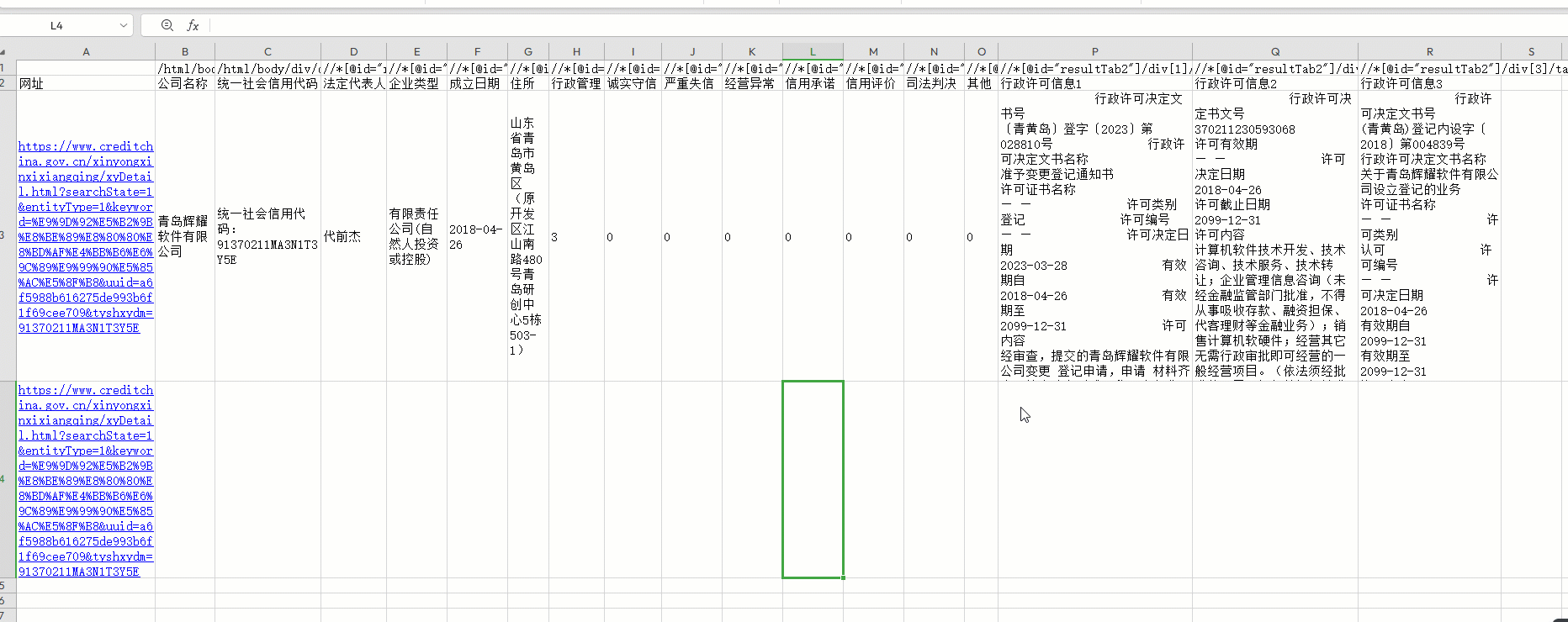 可以将网站【信用中国】上企业的公司名称、统一社会信用代码、法定代表人、企业类型、成立日期、住所、行政管理、诚实守信、严重失信、经营异常、信用承诺、信用评价、司法判决、其他、行政许可信息1、行政许可信息2、行政许可信息3抓取到表格中